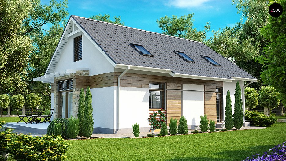 Hiša z bivalno mansardo, dnevno sobo locirano na vhodni strani ter kuhinjo z dvoriščne strani