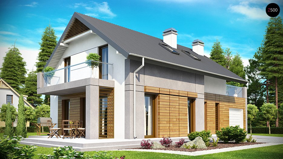 Pomemben del projekta je velika, prostorna dnevna soba s kaminom. Zaradi odprte kuhinjske sestave se zdi prostor še večji. Priročna shramba lahko zlahka sprejme vse izdelke. V pritličju je tudi prostor, ki bo deloval kot spalnica za goste ali študijsko sobo. Projekt predvideva garažo z enim avtomobilom. V prvem nadstropju so tri udobne spalnice. Vsak od njih ima osebni izhod na teraso in balkon. Velika kopalnica bo omogočala pozicioniranje kadi ali prhe. Še več, tam je bil tudi prostor za domačo savno.
