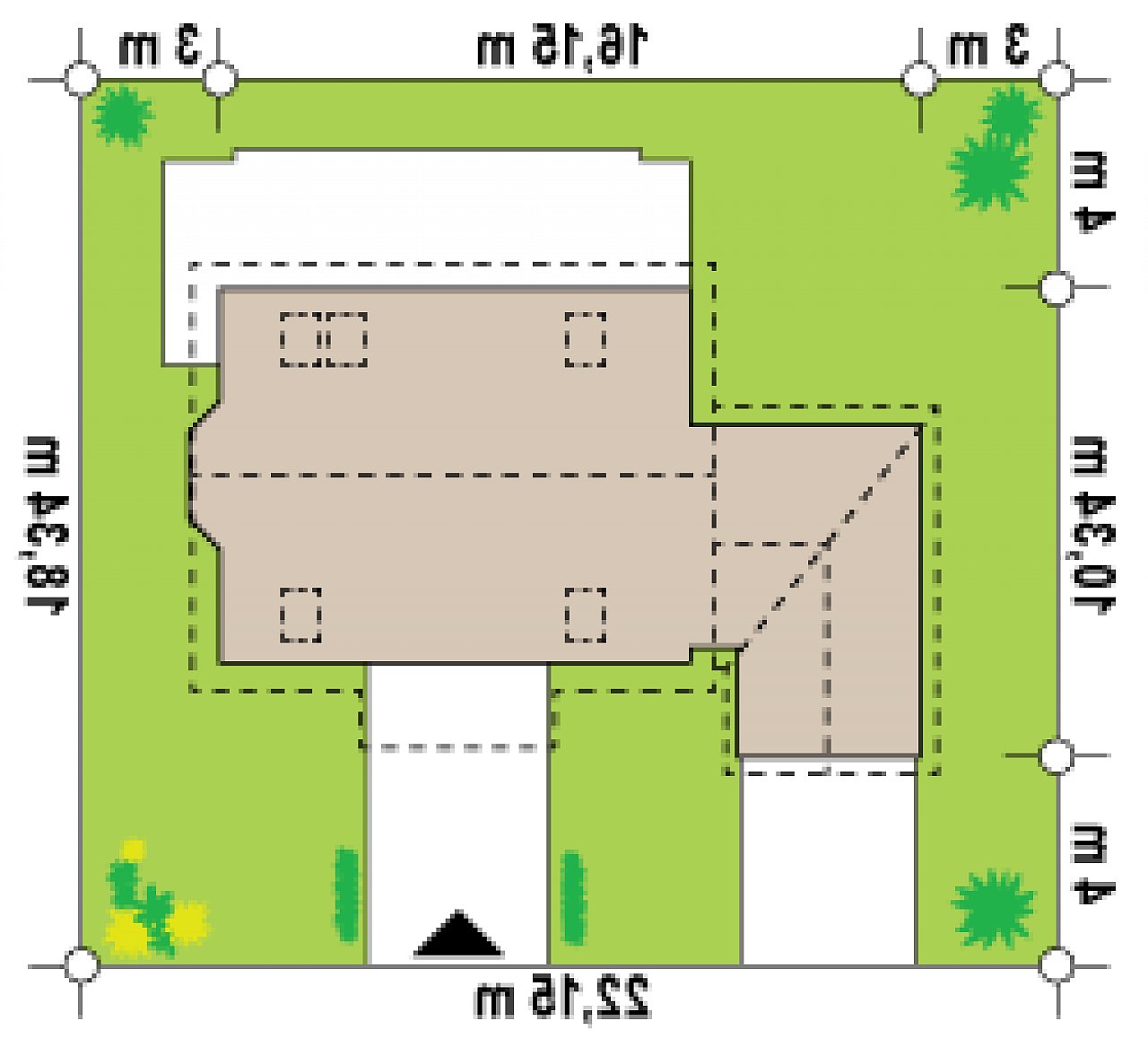 zrcalna verzija z garažo na levi strani in erkerjem v predelu dnevne sobe