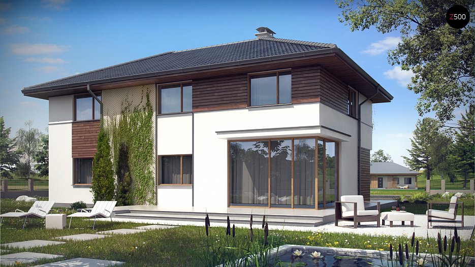 Z159 je funkcionalna in privlačna zasnova doma. Svetle fasade in leseni elementi ji dajejo estetski in svež videz.