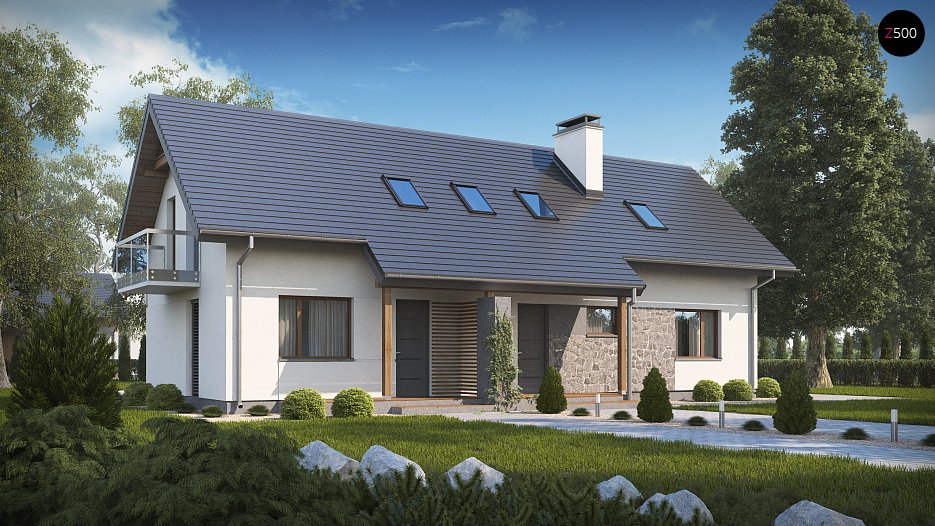 Z184 to dwie części: główna z dużą strefą dzienną, dodatkowym pokojem na parterze, trzema sypialniami na piętrze, oraz mniejsza, idealna także pod wynajem. W obu częściach strefy dziennej znajduje się wygodna funkcjonalna kuchnia, miejsce na stół, salon z kominkiem. W mniejszej zaprojektowano pieco-kominek na ekologiczne, tanie pellety. Nie jest to dodatek konieczny, duże pomieszczenie gospodarcze obsługuje cały budynek, ogrzewa wszystkie pomieszczenia. Na poddaszu mieszczą się trzy pokoje, największa sypialnia posiada własną garderobę. W mniejszej części wydzielono dwa pokoje z balkonem i łazienkę. Konstrukcja umożliwia aranżację tej przestrzeni dowolnie, ścianki można przesuwać lub całkiem usunąć, zostawiając open space np: pod aranżację studia.