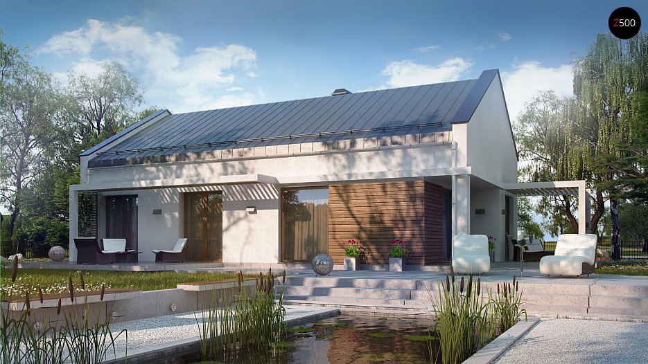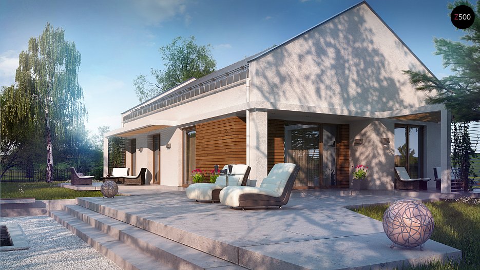 Projekt domu Z258 to propozycja dla inwestorów szukających projektu oryginalnego, ale jednocześnie nawiązującego do tradycji. Pozbawiony okapów dwuspadowy dach i nieco podniesione w stosunku do niego ściany szczytowe eksponują prosty, geometryczny kształt bryły. Od frontu urozmaica ją drewniana pergola, będąca jednocześnie zadaszeniem podestu wejściowego, a z boku pergola płynnie przechodząca w zadaszenie kuchni i jadalni.