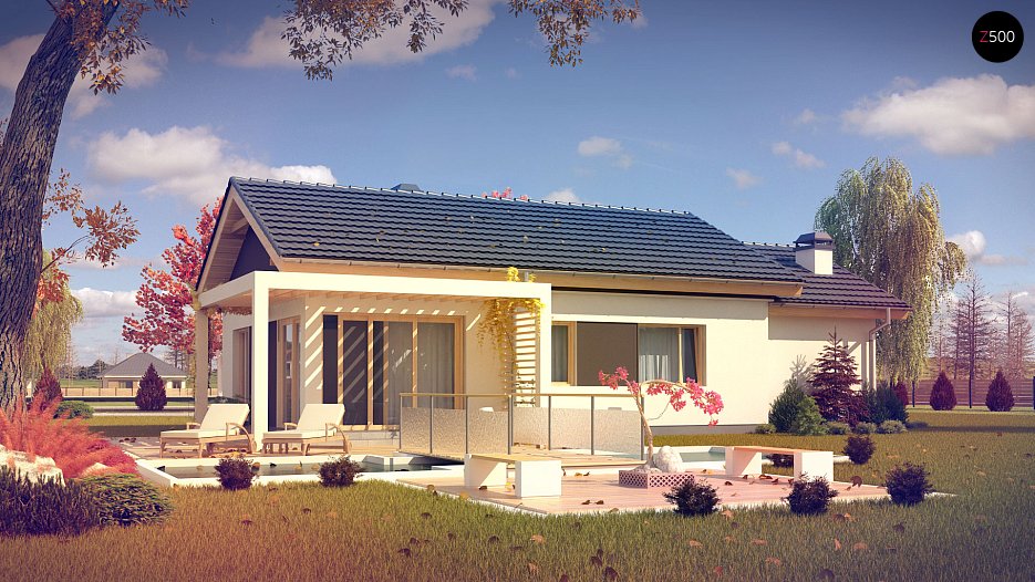 Z259 to propozycja wspaniałego domu parterowego z dwuspadowym dachem i garażem jednostanowieskowym. Wspaniale wkomponuje się w każdą, nawet niewielką działkę. Jasne barwy ścian doskonale współgrają z drewnianymi elementami elewacji i brązową dachówką.