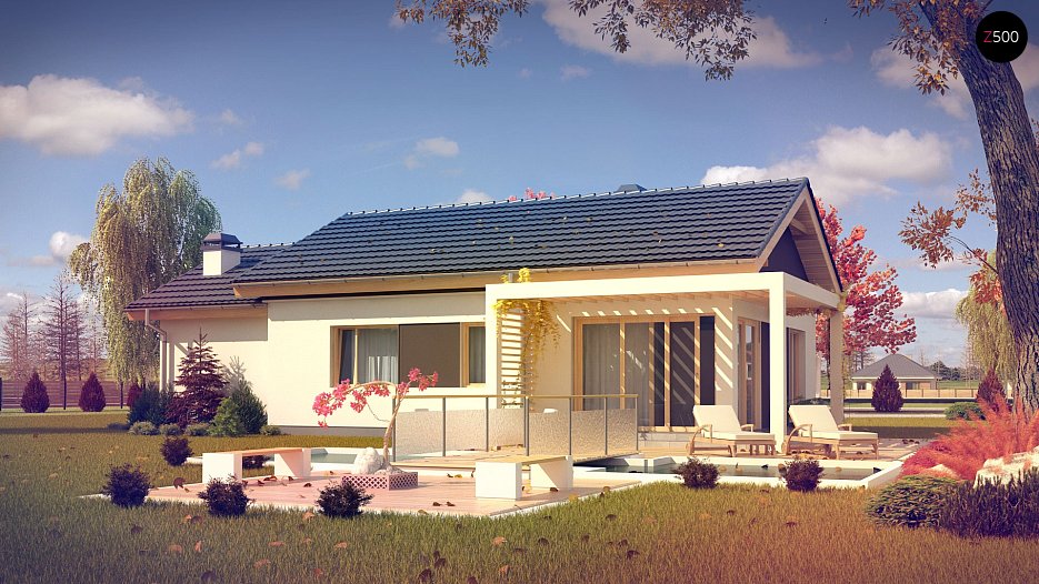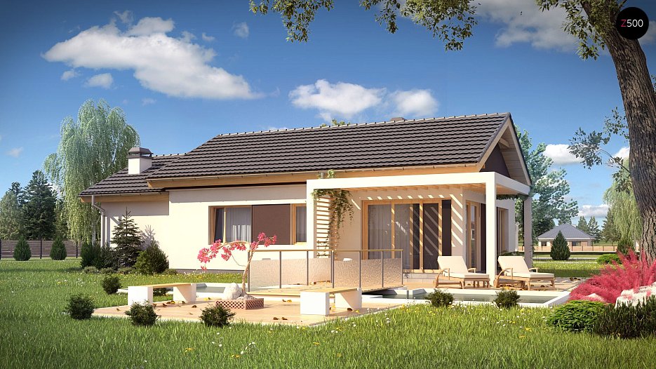Z259 to propozycja wspaniałego domu parterowego z dwuspadowym dachem i garażem jednostanowieskowym. Wspaniale wkomponuje się w każdą, nawet niewielką działkę. Jasne barwy ścian doskonale współgrają z drewnianymi elementami elewacji i brązową dachówką.