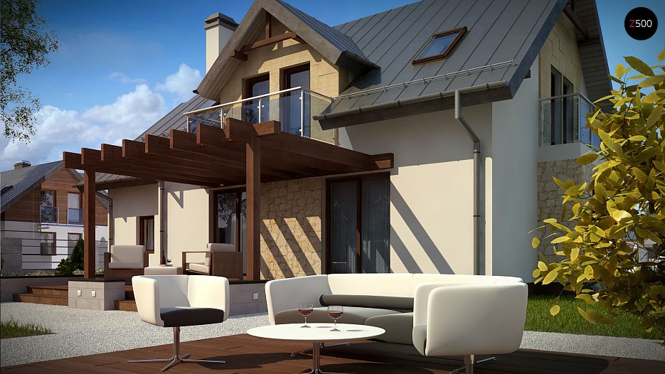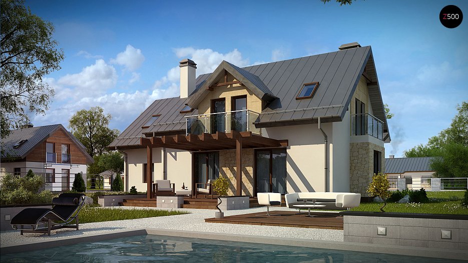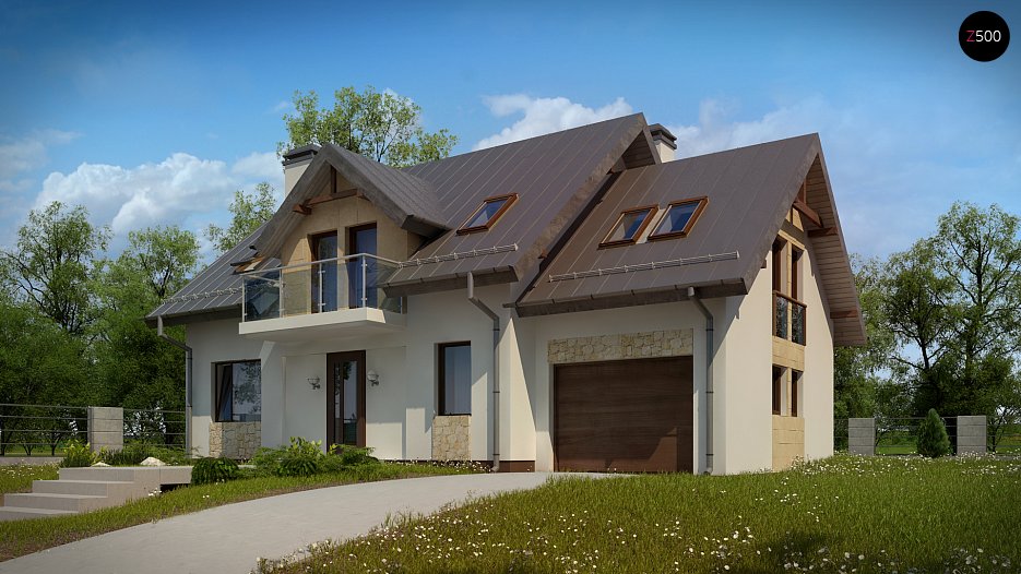 Z263 to dom jednorodzinny z poddaszem użytkowym i garażem jednostanowiskowym. Elewacje utrzymane są w jasnej kolorystyce z nowoczesnymi elementami wykończenia, co nadaje mu niepowtarzalny wygląd.