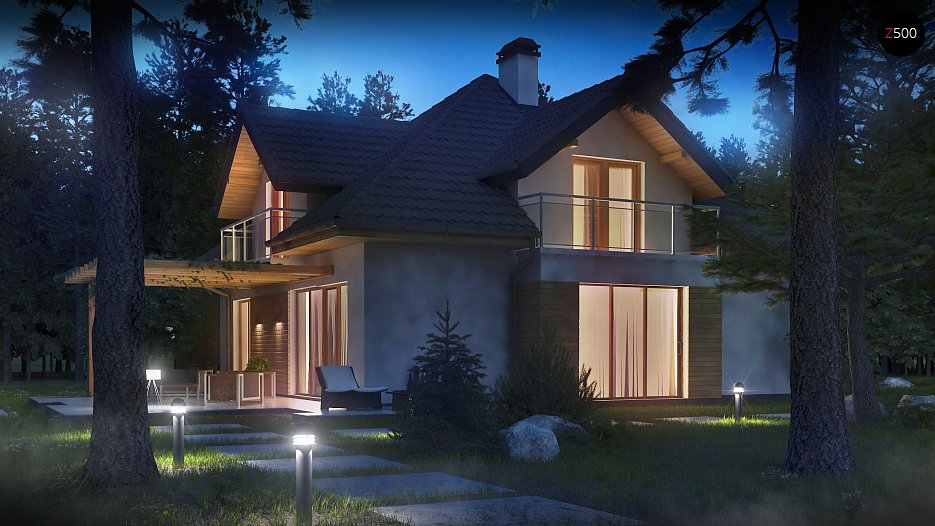 Projekt hiše s podstrešjem. Leseni dodatki na fasadi dajejo hiši zanimiv in edinstven videz.