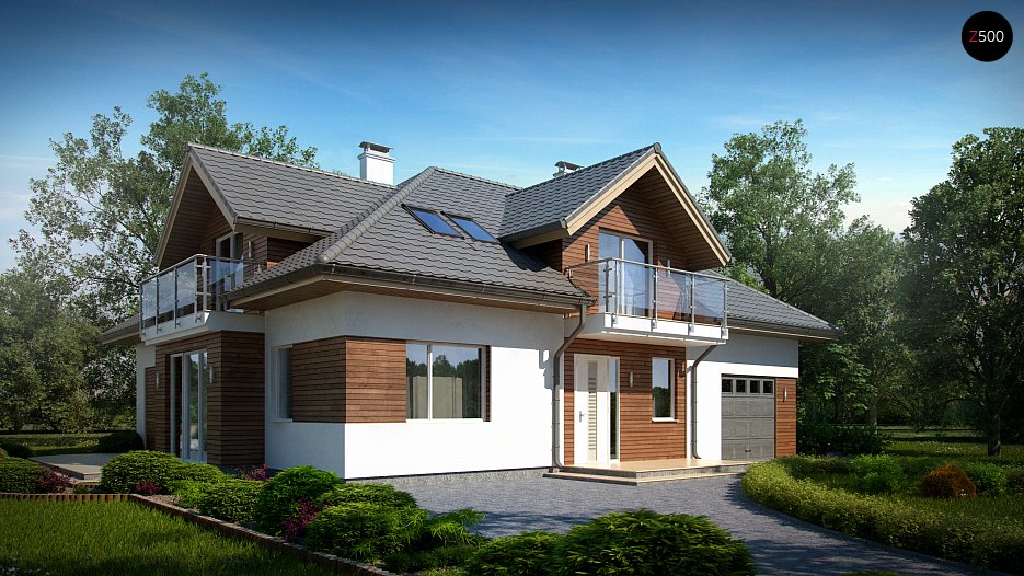 Z275 to projekt domu z poddaszem użytkowym, wykuszem oraz jednostanowiskowym garażem. Dzięki zastosowaniu drewnianych elementów na elewacji, dom nabrał ciekawego wyglądu.