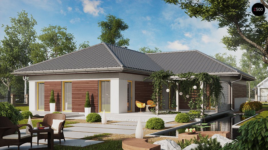 Projekt prijetne in funkcionalne pritlične stanovanjske hiše z garažo v okviru zgradbe.
