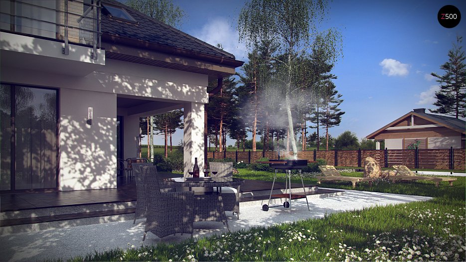 Z283 je udobna hiša v tradicionalnem slogu z garažo z enim avtomobilom. Oblikovana trdna masa je razpršena z nadstrešnicami z balkoni in teraso v spodnjem delu iz dnevne sobe.