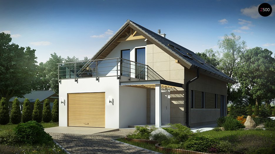Lepa hiša enostavnih linij, z dvokapno streho, za ožje parcele in garažo s prednje strani.