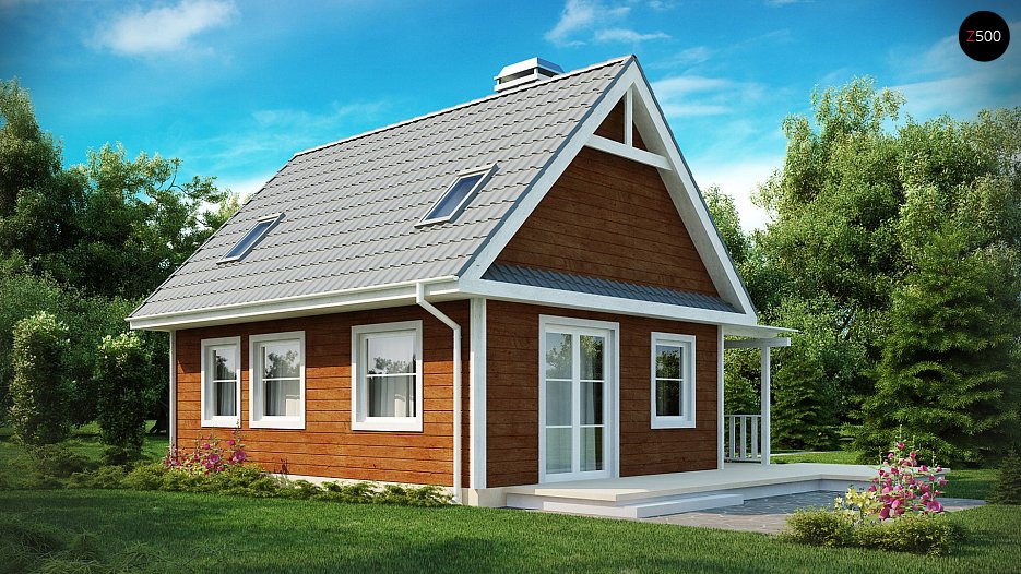 Z39 Načrt manjše, lepe lesene hiše, z mansardo in teraso s prednje strani