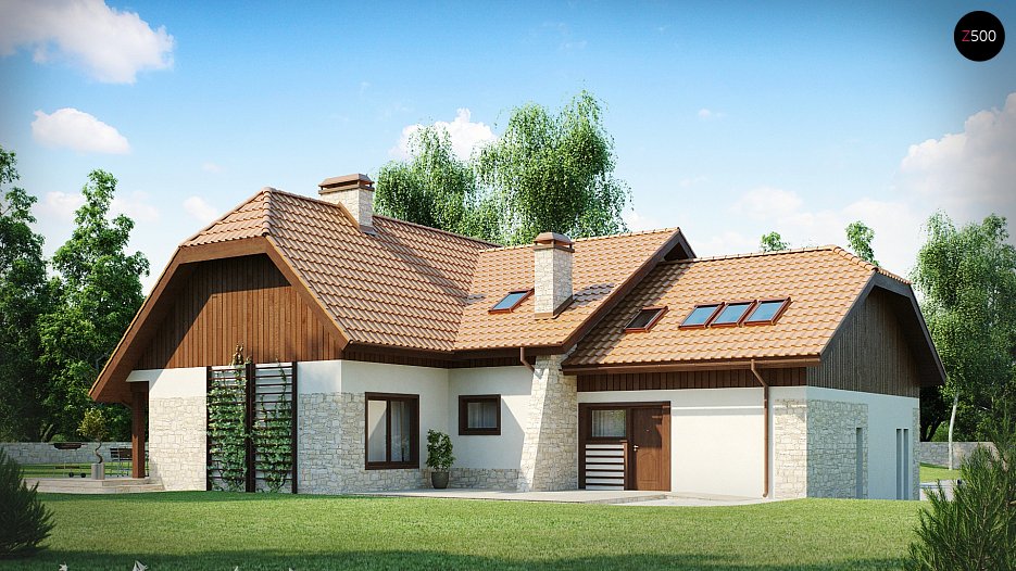 Kompaktna, funkcionalna hiša z mansardo, garažo za dva avta in zanimivimi detalji fasade
