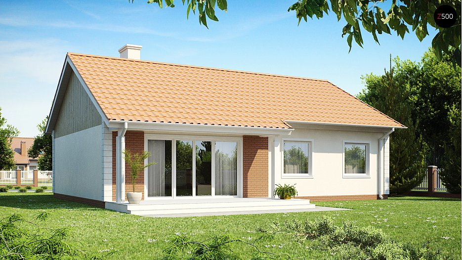 Projekt manjše pritlične hiše, z dvokapno streho, tremi sobami in večjo kuhinjo