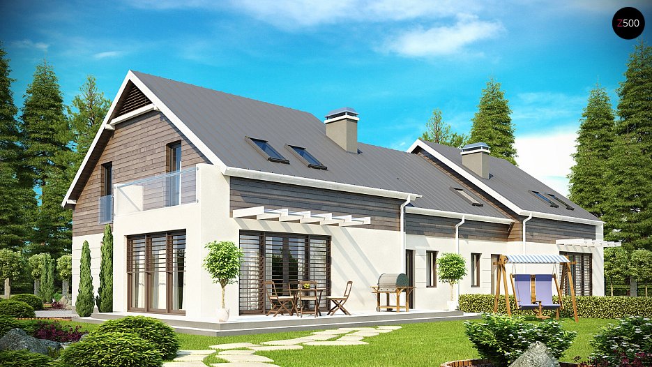 Zb3 je funkcionalna hišna zasnova s ​​podstrešjem, v katerem je dvignjena stena kolena. Karoserija je preproste v konstrukciji, pokrita s podokno streho, oblečena je v ustrezne dodatke in ležišče. Les v orehovi barvi je kombiniran s toplimi bež in sivimi strešniki. Zaradi plastičnosti fasade se hiša ujema tako z gozdno pokrajino parcele kot s primestno pokrajino.