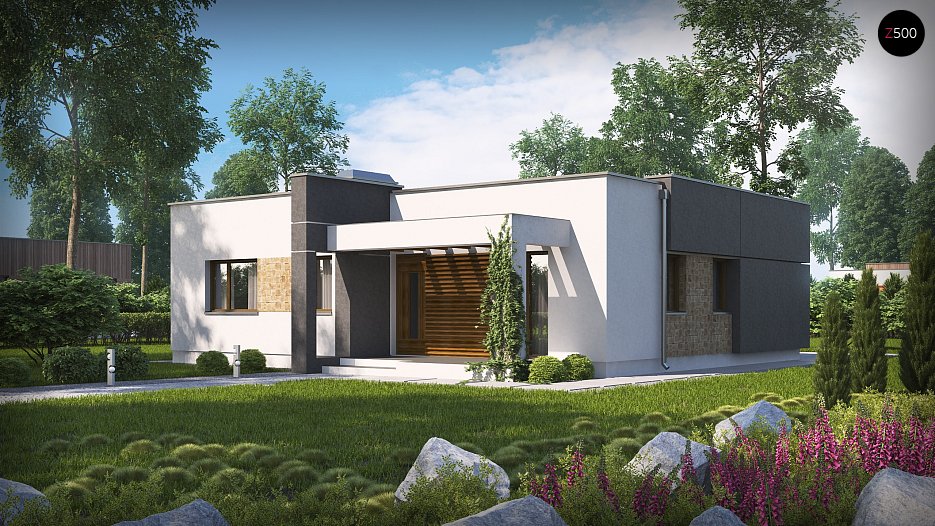 Zx105 - kompaktna pritlična družinska hiša z ravno streho.