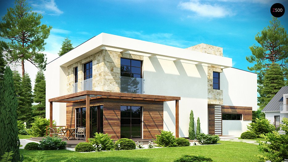 Zx14 to innowacyjny projekt piętrowego domu z licznymi przeszkleniami, dzięki którym otoczenie stanowi naturalne dopełnienie przestrzeni wnętrz. Ciekawa podłużna i kubiczna bryła, wzbogacona została elementami z drewna i kamienia. Garaż na dwa stanowiska oraz boczne wejście pozwolą usytuować dom także na wąskiej działce.