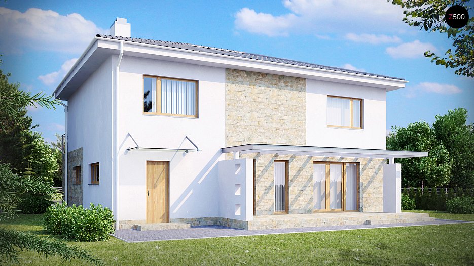 Projekt ZX4 to propozycja dla osób ceniących sobie nowoczesne wzorce. Prosta, foremna bryła budynku wzbogacona została elementami kamienia, stali i ciepłego drewna.