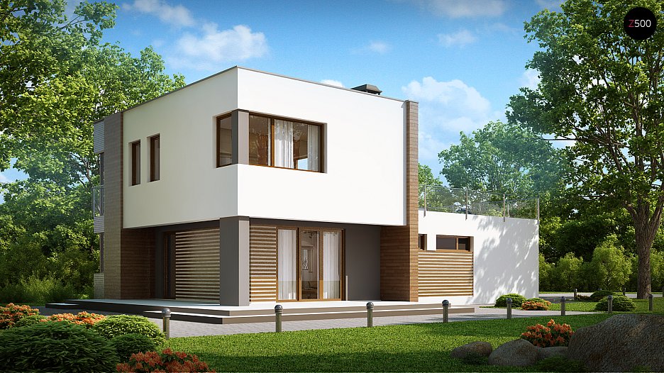Nadstropna hiša v modernem stilu, z ravno streho in večjo teraso nad garažnim delom