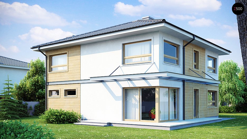 Zx7 to nowoczesny dom piętrowy z garażem dwustanowiskowym wysuniętym od frontu, dzięki czemu pasuje także do węższej działki. Charakterystyczna kubiczna forma została przekryta kopertowym dachem oraz wzbogacona elementami drewna na elewacjach. Projekt posiada przejrzysty układ funkcjonalny.