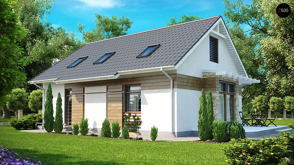 Hiša z bivalno mansardo, dnevno sobo locirano na vhodni strani ter kuhinjo z dvoriščne strani