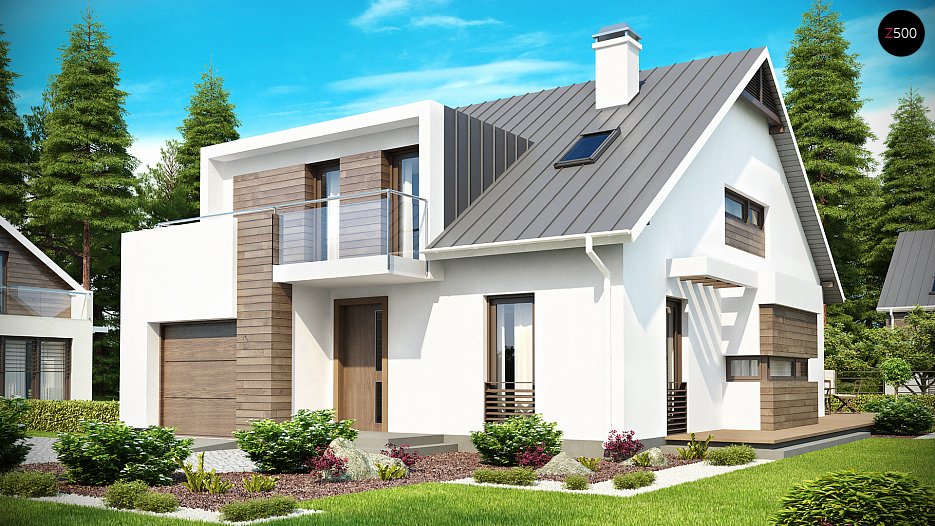 Z116 Tipski projekt moderne hiše, z bivalno mansardo, erkerjem, zanimivo frčado ter garažo
