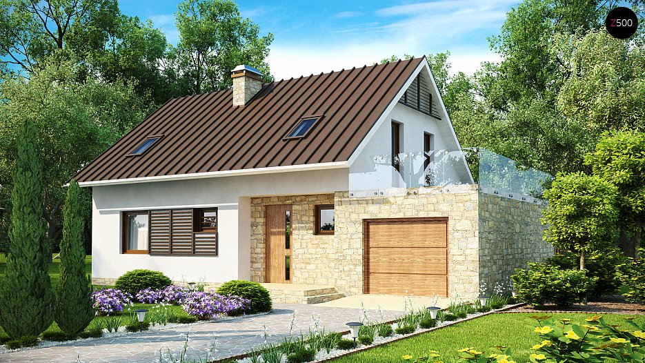 Načrt manjše, kompaktne hiše z mansardo in sobo v pritličju ter teraso nad garažo