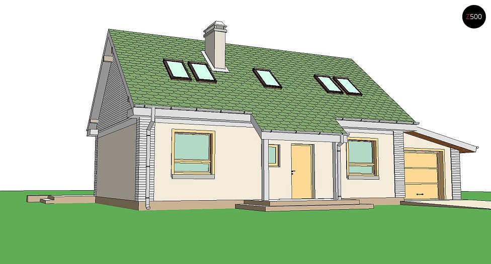Zasnova hiše Z12 z garažo na levi strani (19,3m2) in vgrajeno vhodno verando. Obstaja možnost razvoja podstrešnega prostora.