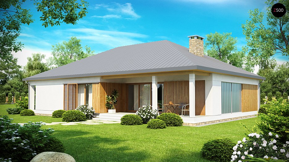 Z152 je sodoben predlog klasične enonadstropne hiše z garažo za dva avtomobila v bloku. Naravni, leseni elementi fasade se odlično ujemajo s sivimi strešniki. Srce hiše je prostorna dnevna soba, okoli katere je osredotočeno celotno družinsko življenje. Kuhinja ima lahko dostopno shrambo s prostorom za garderobe. Skozi shrambo lahko pridete do pomožnega prostora, kjer je celotna osnova dimnika s pečjo in gorivom za gorivo. Soba ima svoj strešni izhod na vrt, kar olajša uporabo, zlasti spomladi in poleti.