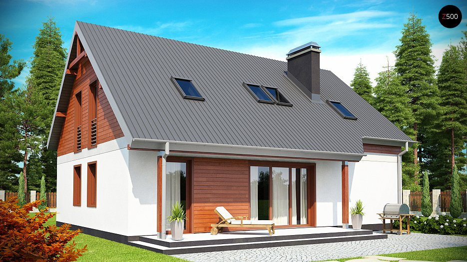 Z164 je enodružinska hiša z dvema nadstropjema in eno samo garažo. Preprosta, kompaktna karoserija, pokrita s podokno streho in enim dimnikom, je ekonomska naložba v gradbeništvo. Siva kovinska strešna ploščica, temna lesena obloga na fasadi in lahki omet primerno poudarjajo sodobni značaj stavbe. Dodatne prednosti vključujejo široko vhodno arkado in pokrito teraso. Na majhnem območju nam je uspelo zagotoviti bogat uporabni program, obogaten s široko gospodarsko osnovo. Dnevna cona se nahaja v pritličju. Ustvari reprezentativno dnevno sobo s kaminom v kombinaciji z jedilnico in prostorno kuhinjo. Na voljo je tudi veliko stranišče z oknom, priročna shramba, prostor za garderobne omare, prostorna tehnična soba ob garaži in pomožni prostor, do katerega je mogoče dostopati od garaže do dvorane. Nočno cono v prvem nadstropju sestavljajo tri velike spalnice s kopalnico in garderobo. Soba gostiteljev ima svojo kopalnico in ločeno garderobo.