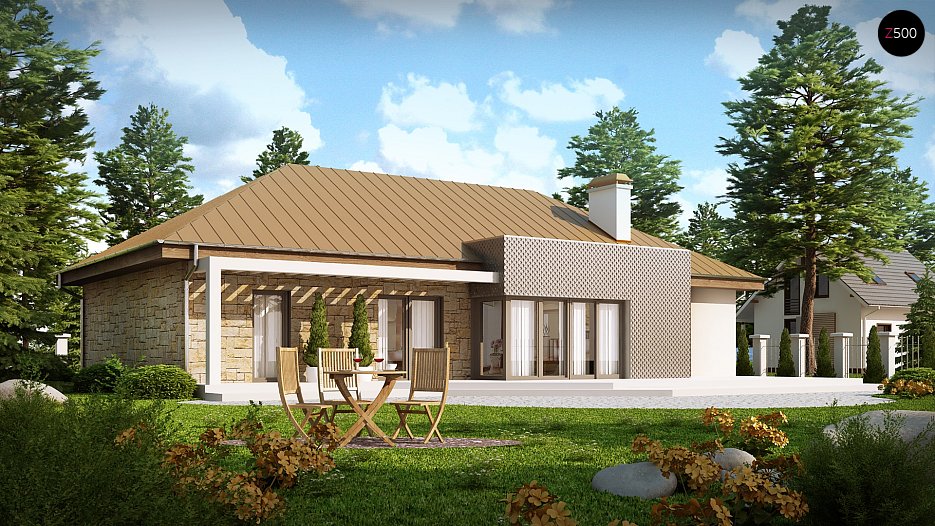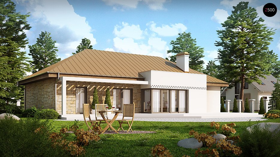 Nedvomna prednost hiše je velika pokrita terasa na vrtni strani. Prednost te enonadstropne hiše je pomanjkanje stopnic in s tem enostavna notranja komunikacija. V njem so praktični ljudje, ki želijo doseči kompromis med zmogljivostjo hiše in njenim obsegom. Kontrast široko uporabljenega kamna preprostemu kompaktnemu ohišju in velikim zasteklitvam je glava pogumnim ljudem, ki imajo radi izzive.