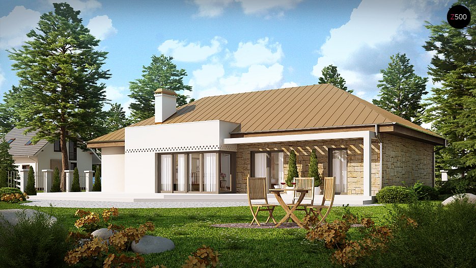 Nedvomna prednost hiše je velika pokrita terasa na vrtni strani. Prednost te enonadstropne hiše je pomanjkanje stopnic in s tem enostavna notranja komunikacija. V njem so praktični ljudje, ki želijo doseči kompromis med zmogljivostjo hiše in njenim obsegom. Kontrast široko uporabljenega kamna preprostemu kompaktnemu ohišju in velikim zasteklitvam je glava pogumnim ljudem, ki imajo radi izzive.