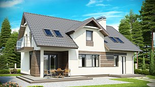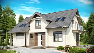 Tipski načrt mansardne hiše z dvokapno streho, frčado in balkonom ter garažo