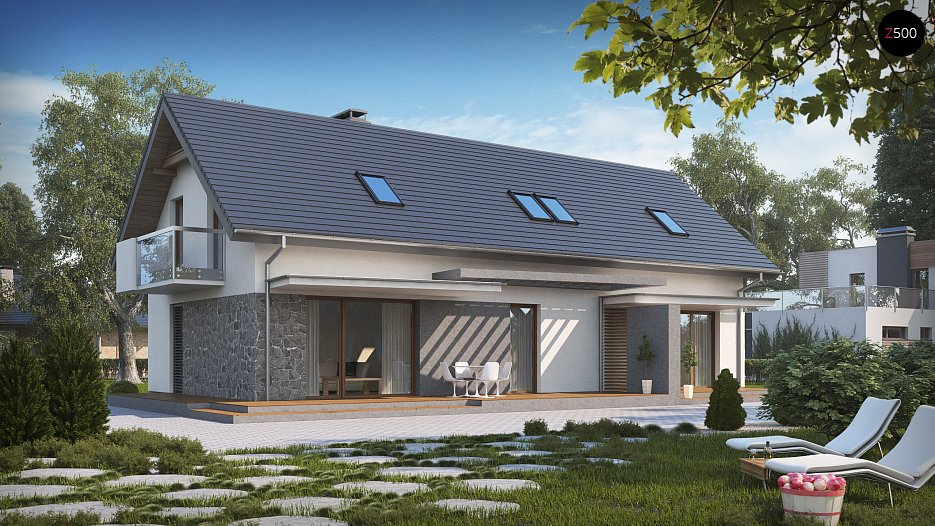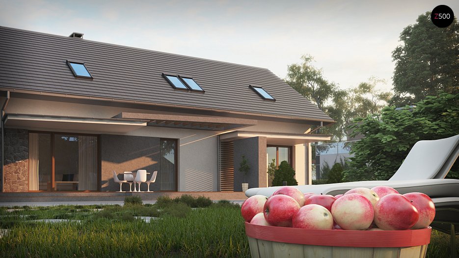 Z184 to dwie części: główna z dużą strefą dzienną, dodatkowym pokojem na parterze, trzema sypialniami na piętrze, oraz mniejsza, idealna także pod wynajem. W obu częściach strefy dziennej znajduje się wygodna funkcjonalna kuchnia, miejsce na stół, salon z kominkiem. W mniejszej zaprojektowano pieco-kominek na ekologiczne, tanie pellety. Nie jest to dodatek konieczny, duże pomieszczenie gospodarcze obsługuje cały budynek, ogrzewa wszystkie pomieszczenia. Na poddaszu mieszczą się trzy pokoje, największa sypialnia posiada własną garderobę. W mniejszej części wydzielono dwa pokoje z balkonem i łazienkę. Konstrukcja umożliwia aranżację tej przestrzeni dowolnie, ścianki można przesuwać lub całkiem usunąć, zostawiając open space np: pod aranżację studia.