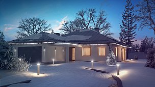Pritlična hiša s funkcionalnimi interierji, erkerjem in garažo za dva avta s prednje strani