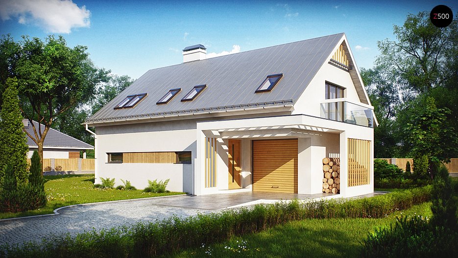 Projekt Z235 je dvonadstropna hiša s podokno streho in garažo z enim avtomobilom. Učinkovit zaključek fasade z vgradnjo lesenih elementov poudarja njen edinstven značaj.