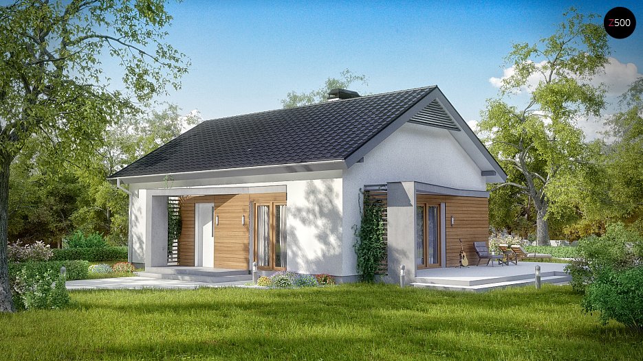 Z500 je tipski projekt harmonije tradicionalnih oblik in sodobnih podrobnosti. Njena preprosta poševna streha, naredi hišo ekonomično.