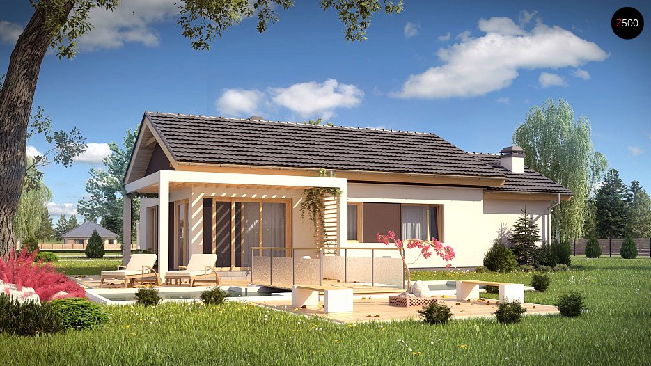 Z259 to propozycja wspaniałego domu parterowego z dwuspadowym dachem i garażem jednostanowieskowym. Wspaniale wkomponuje się w każdą, nawet niewielką działkę. Jasne barwy ścian doskonale współgrają z drewnianymi elementami elewacji i brązową dachówką.
