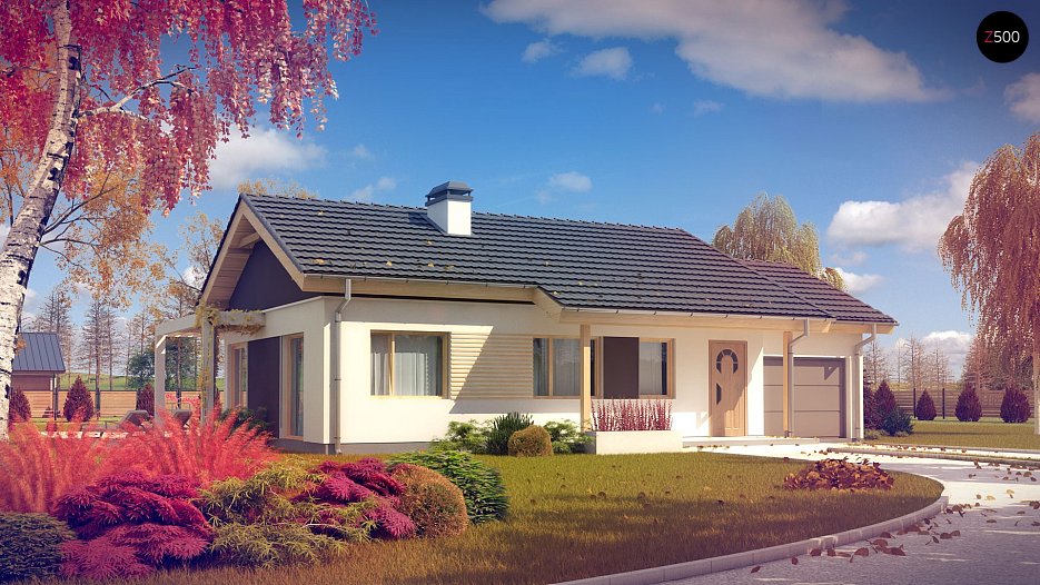 Z259 to propozycja wspaniałego domu parterowego z dwuspadowym dachem i garażem jednostanowieskowym. Wspaniale wkomponuje się w każdą, nawet niewielką działkę. Jasne barwy ścian doskonale współgrają z drewnianymi elementami elewacji i brązową dachówką.