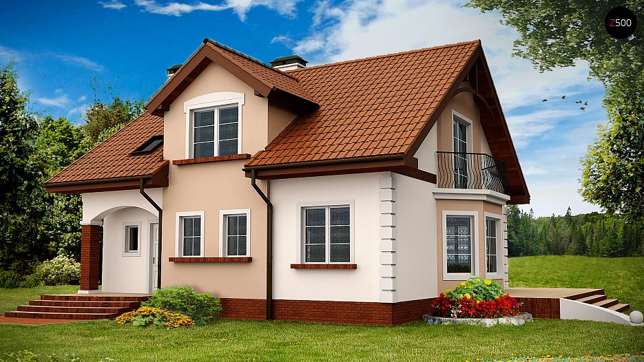 Projekt hiše z izrabljeno -bivalno mansardo, frčado, erkerjem in stransko teraso