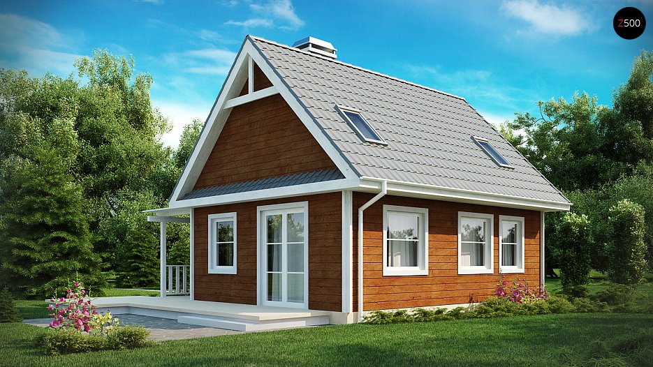 Z39 Načrt manjše, lepe lesene hiše, z mansardo in teraso s prednje strani