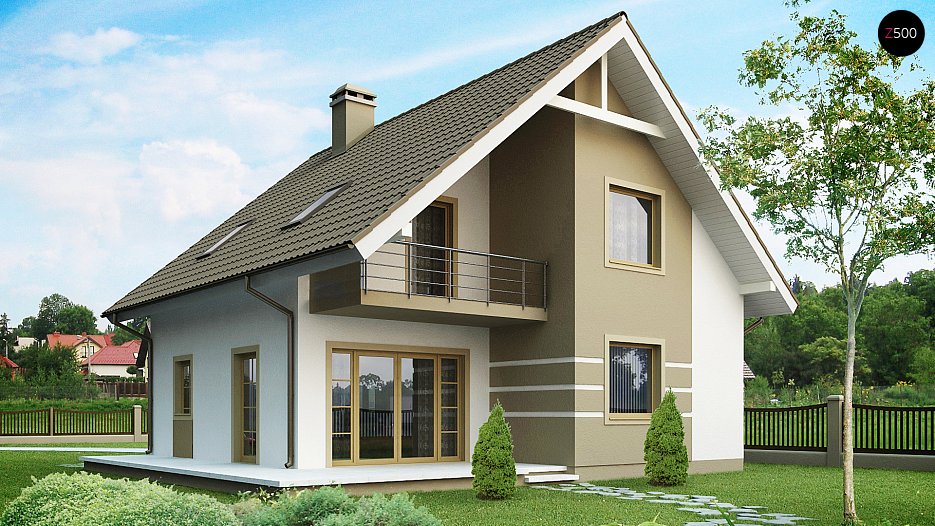 Projekt lepo dizajnirane hiše z bivalno mansardo, dvokapno streho in balkonom