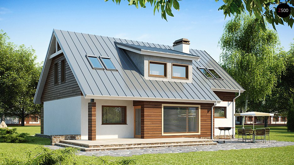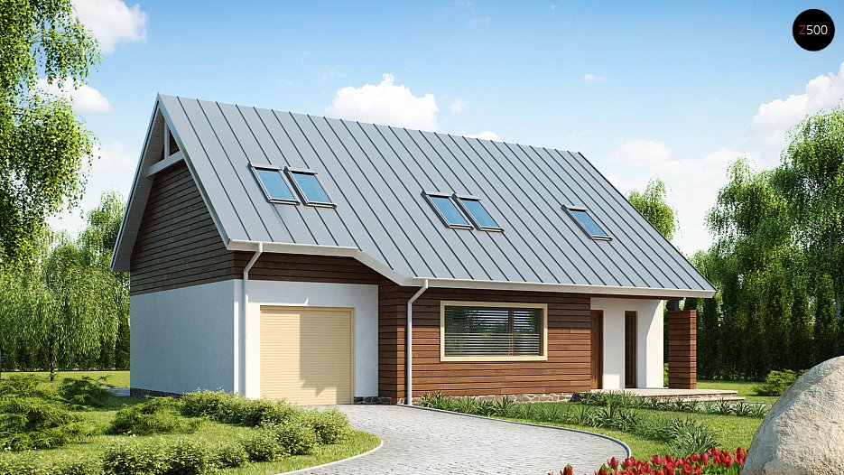 Tipski projekt kompaktne, funkcionalne hiše, z garažo za en avto in bivalno mansardo