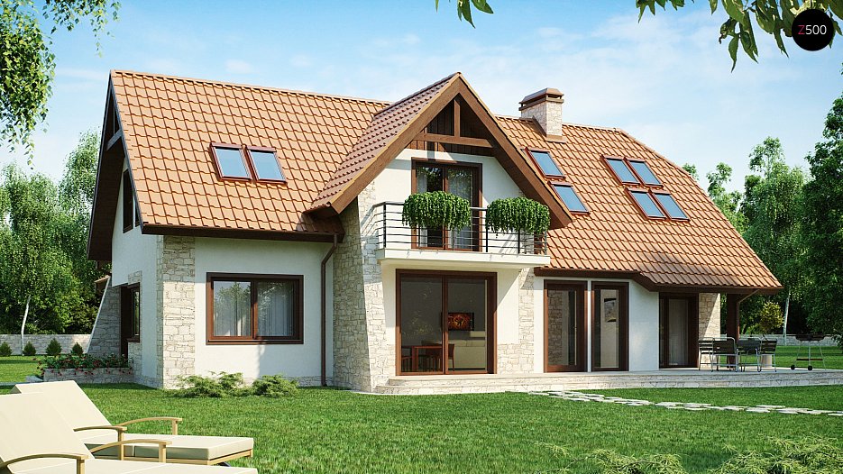 Kompaktna, funkcionalna hiša z mansardo, garažo za dva avta in zanimivimi detalji fasade