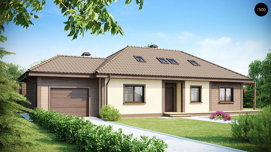 Projekt lepe hiše z bivalno mansardo in bočno garažo