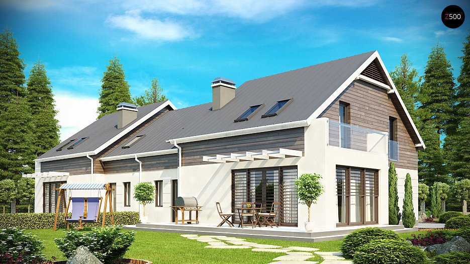 Zb3 je funkcionalna hišna zasnova s ​​podstrešjem, v katerem je dvignjena stena kolena. Karoserija je preproste v konstrukciji, pokrita s podokno streho, oblečena je v ustrezne dodatke in ležišče. Les v orehovi barvi je kombiniran s toplimi bež in sivimi strešniki. Zaradi plastičnosti fasade se hiša ujema tako z gozdno pokrajino parcele kot s primestno pokrajino.