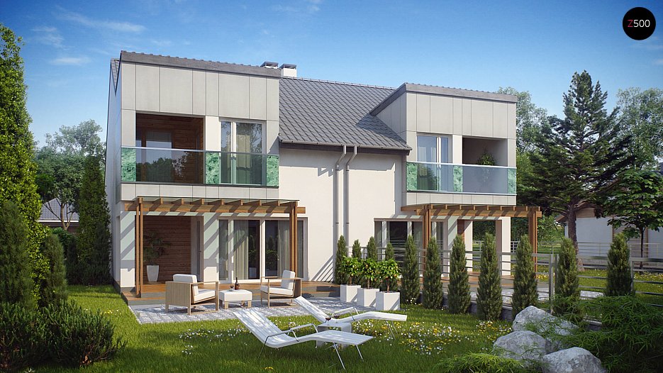 Nedvomna prednost zasnove je udobna funkcionalna ureditev in prilagodljiva dnevna soba s kaminom. Pokrita terasa je idealen kraj za sprostitev obdan s čudovitim vrtom. funkcionalne dimenzije določajo udobje in udobje uporabe. Prvo nadstropje je nočni del hiše. Na voljo so tri prostorne, udobne spalnice. Vsak od njih ima svojo funkcionalno garderobo. Dodatne sobe vključujejo očarljiv balkon in lastno kopalnico.