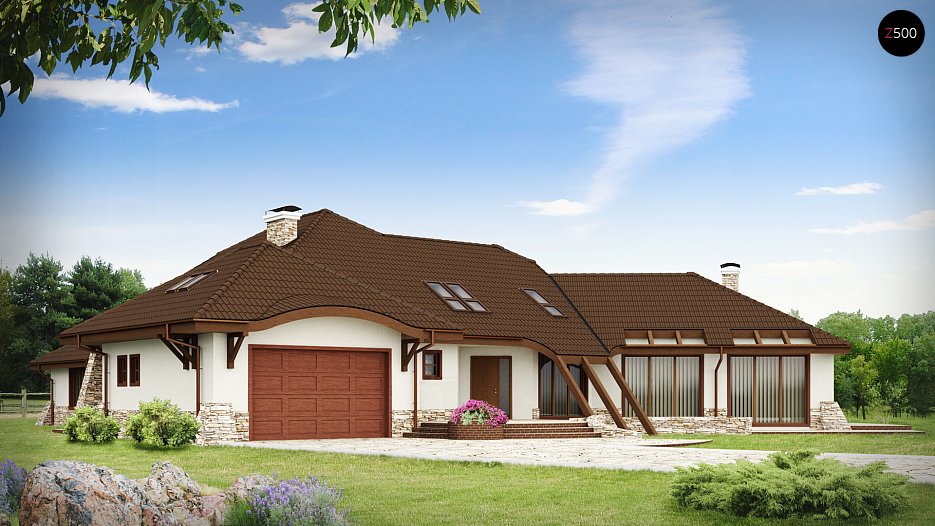 Projekt Zr1 je razširjena rezidenca, ki se popolnoma prilega velikim zelenim površinam. Arhitektura stavbe in zunanje fasade so bogate z detajli iz lesa in kamna. Blok stavbe se nežno ujema z okoljem in okoliško naravo. Skrivnost izvirnosti in edinstvenosti fasade sta popolnoma usklajena razmerja posameznih delov hiše in doslednost uporabljenih materialov in dodatkov. Telo tega bivališča je rafinirano do najmanjših podrobnosti na vsaki strani. Hiša izgleda fantastično od spredaj, z ulice ali vhoda, pa tudi z vrta, kjer so tudi zunanje spiralne stopnice, ki vodijo na teraso.