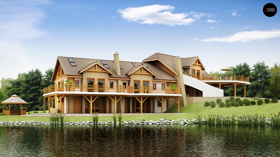 Stavba je prekrita s podokno streho in ima obsežno teraso, ki je skladno povezana s terenom in fasadnimi elementi. Blok je obogaten s dimniki v obliki visokih poševnih nosilcev in naravnih elementov okrasitve fasad. Nivo garaže je pritličje rekreacijskega območja, nad katerim je nadstropje, dostopno z neodvisnega vhoda. Izhod na vrt je pokrit s terasastimi ploščicami. Zunanje fasade so stilizirane z oblogami iz lokalnega kamna ali cepljenega peščenjaka.