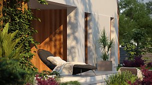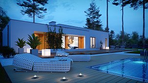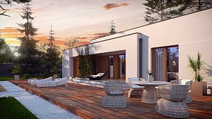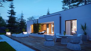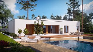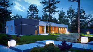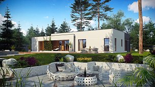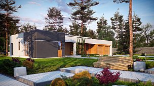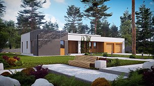 Zx102 je moderna enonadstropna hiša iz kolekcije Parto v elegantnem, modernističnem slogu. Preprosta, kubična oblika je raznolika z arkadami od vhoda in dnevne sobe - odličen kraj za sprostitev.Prednost zasnove je prostoren pripomoček, idealen kot kotlovnica na trda goriva. Priročna shramba, dostopna s terase, dobro deluje kot vrtno orodje in pohištvo.Dnevna cona je prostorna dnevna soba z veliko kuhinjo v odprti sestavi. Prostore lahko po potrebi ločite s predelno steno. Shramba pripada kuhinji. Dnevna soba vodi na pokrito teraso. Na nasprotnem delu stavbe je bila ločena nočna cona s tremi udobnimi sobami. Za gospodinjstva sta na voljo tudi dve kopalnici, manjša s kabino in večja v bližini spalnice. Poleg tega program koristno obogati majhno sobo z oknom, ki lahko deluje kot perilo ali garderoba. Povečate jih lahko tudi tako, da odstranite garderobo v preddverju.