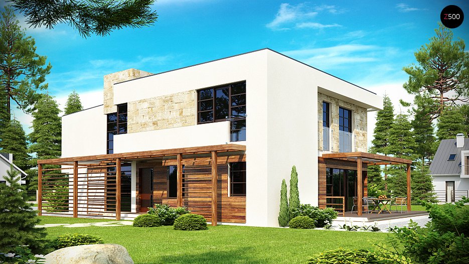Zx14 to innowacyjny projekt piętrowego domu z licznymi przeszkleniami, dzięki którym otoczenie stanowi naturalne dopełnienie przestrzeni wnętrz. Ciekawa podłużna i kubiczna bryła, wzbogacona została elementami z drewna i kamienia. Garaż na dwa stanowiska oraz boczne wejście pozwolą usytuować dom także na wąskiej działce.